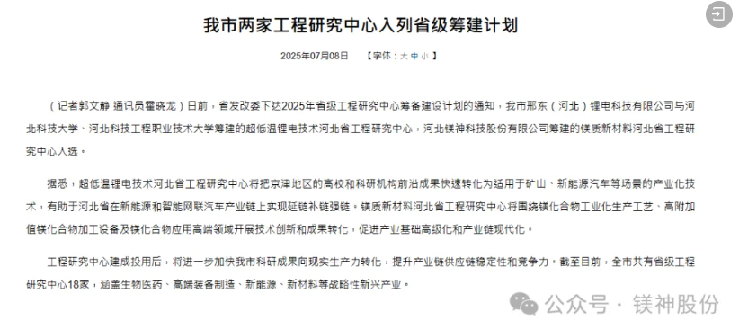 2025年7月8日,河北省發(fā)展和改革委員會(huì)正式公布了新一批河北省工程研究中心籌建計(jì)劃入選名單。由河北鎂神科技有限公司(簡稱:鎂神科技)牽頭籌建的“鎂質(zhì)新材料河北省工程研究中心”經(jīng)過嚴(yán)格遴選和專家評(píng)審,成功獲批立項(xiàng),正式列入省級(jí)工程研究中心籌建計(jì)劃名單!這是鎂神科技發(fā)展歷程上的又一重要里程碑,也是河北省對(duì)我公司在鎂質(zhì)新材料領(lǐng)域創(chuàng)新能力與發(fā)展?jié)摿Φ母叨日J(rèn)可!